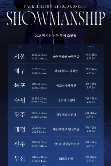 2025년, 박지현이 전국 팬들을 찾아갑니다. 오는 2월 15일, 서울 올림픽공원 올림픽홀을 시작으로 대구, 목포, 수원, 광주, 대전, 전주, 부산까지 이어지는 대장정의 서막이 열립니다. '나혼자 산다' 출연하면서 얼굴과 엔터 재능을 널리 우리에게 알렸는데요. 그래서 더 이번 콘서트는 정말 기대 됩니다. 이번 서울 콘서트를 놓치신 분들은 다음 예정된 전국콘서트에서 다시 만날수 있을수 있으니 빠른 티켓팅 구매에 서두르세요!