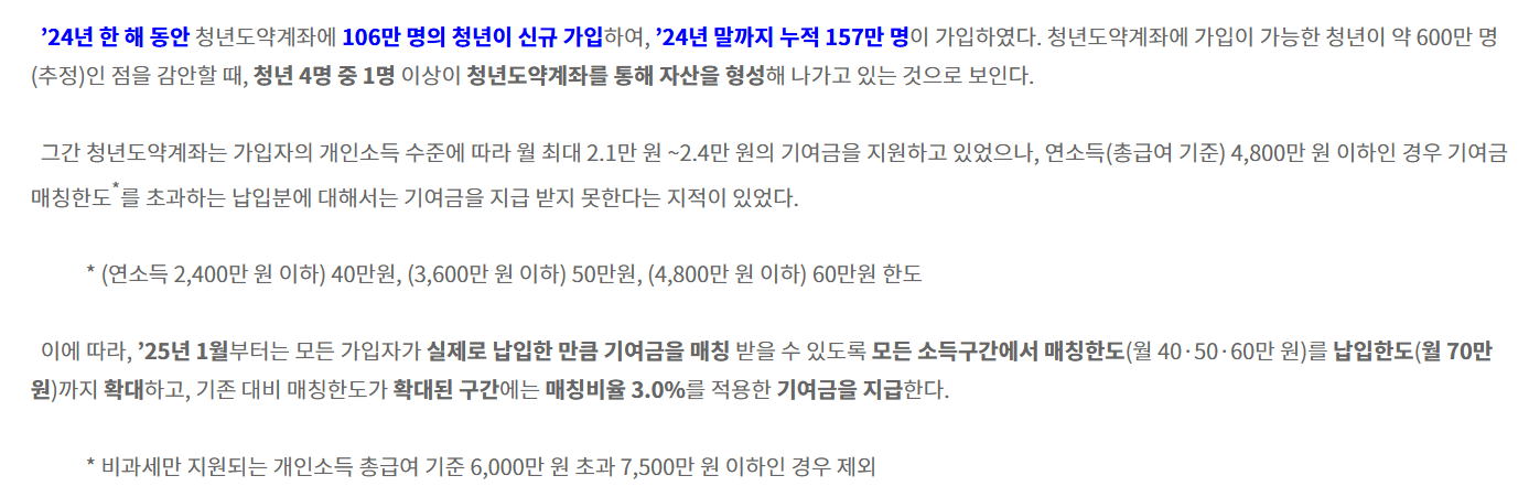 ’25년 1월부터 청년도약계좌 기여금이 확대됩니다. ’24년 한 해 동안 106만 명 신규 가입, ’24년말 기준 누적 157만 명 가입 ’25년 1월 납입분부터 청년도약계좌 기여금 지원 수준 확대 적